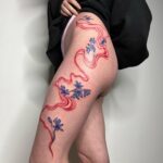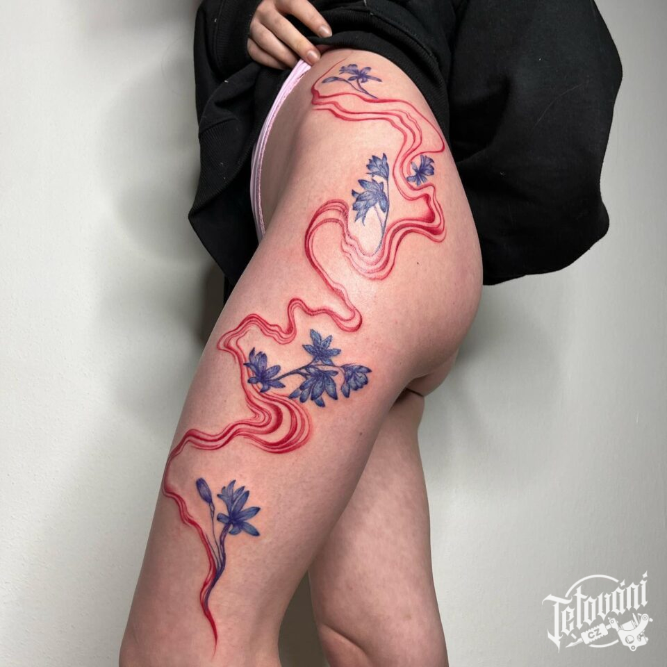 Tetování květiny, čáry a pruhy na boku stehna