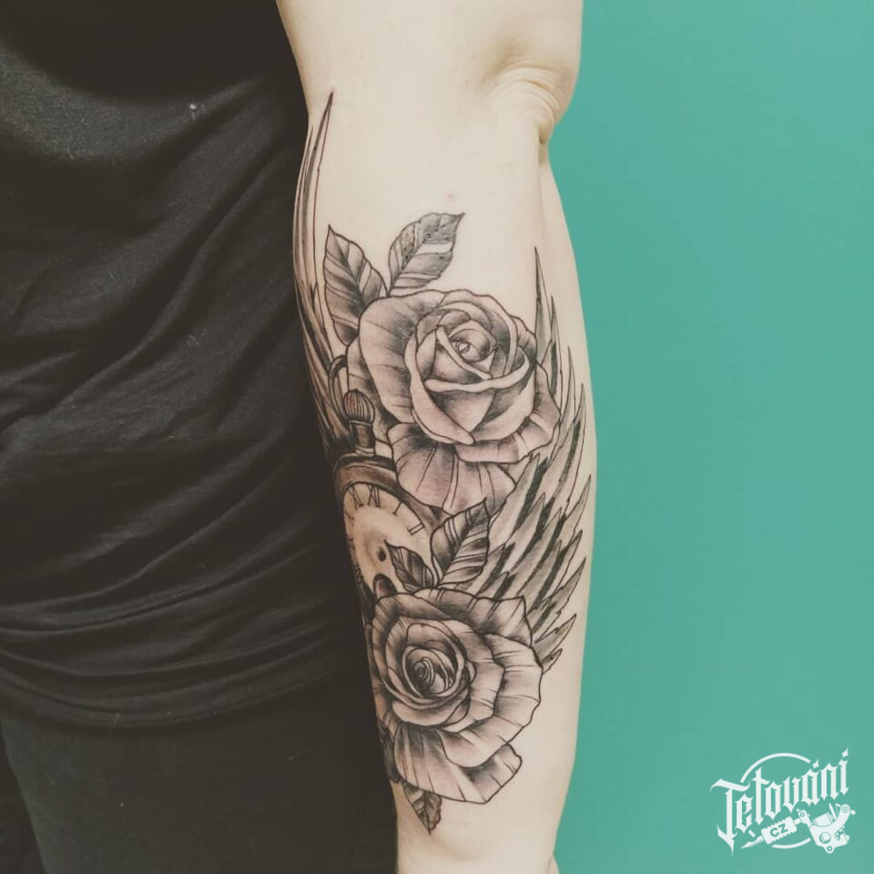 Tetování květiny, hodiny a růže na předloktí