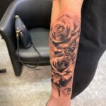 Tetování květiny, hodiny a růže na předloktí