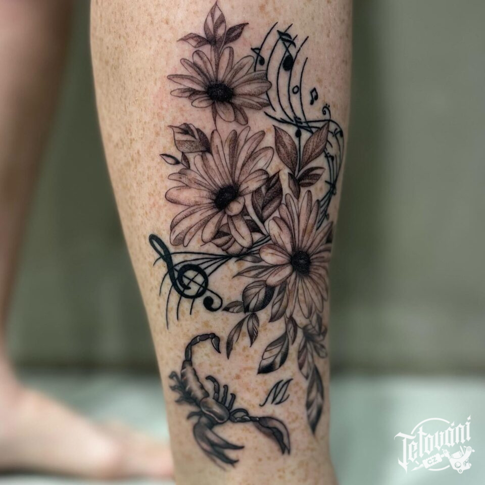 Tetování květiny, hudba na lýtku