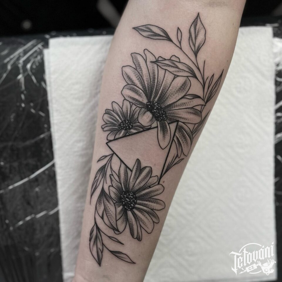 Tetování květiny, kopretina, tvary na předloktí