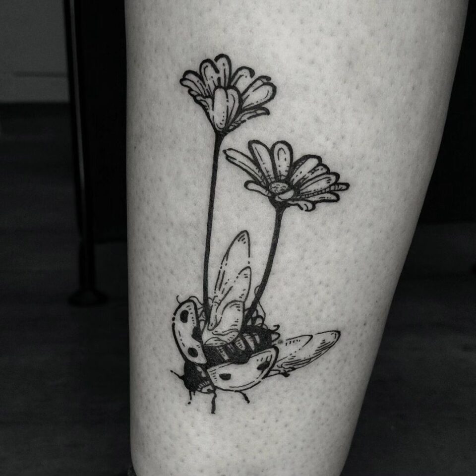 Tetování květiny kopretina, zvíře beruška na lýtko