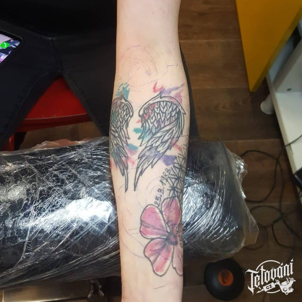 Tetování květiny, křídla na předloktí