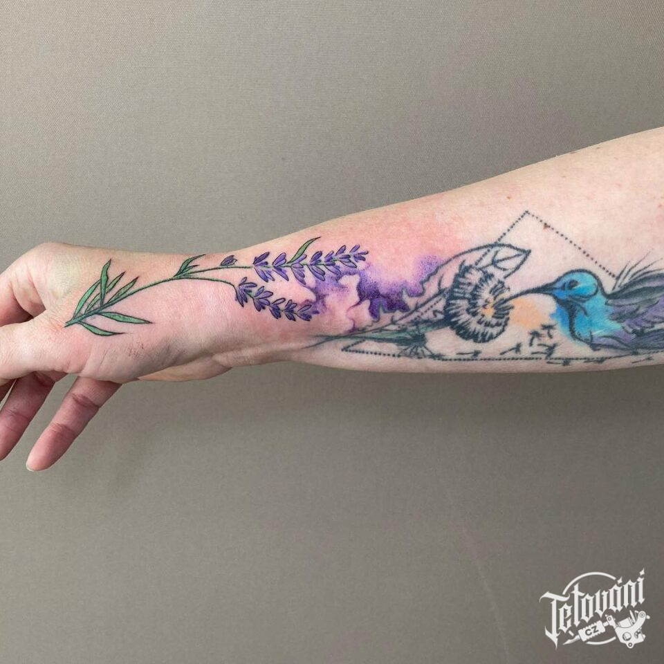 Tetování květiny, levandule a zvířata, kolibřík na předloktí