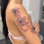 Tetování květiny, lilie a abstraktní čáry na rameno