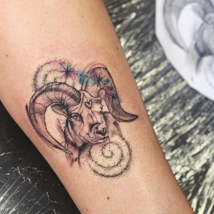 Tetování květiny, lilie, beran znamení zvěrokruhu, nápis na předloktí