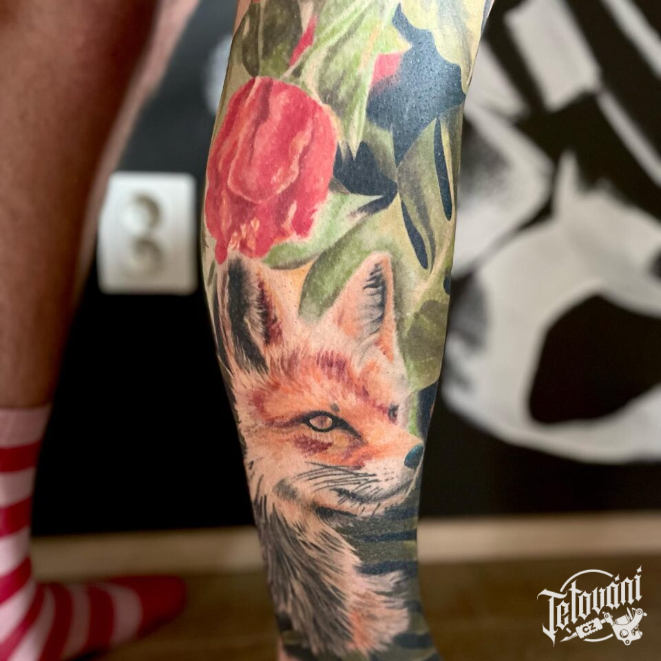 Tetování květiny, liška na lýtku