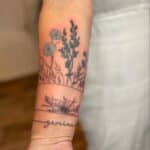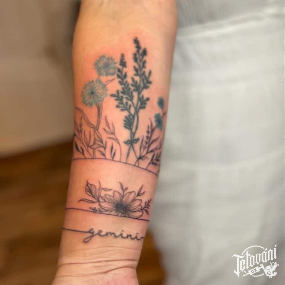 Tetování květiny, luční kvítí a nápis na předloktí