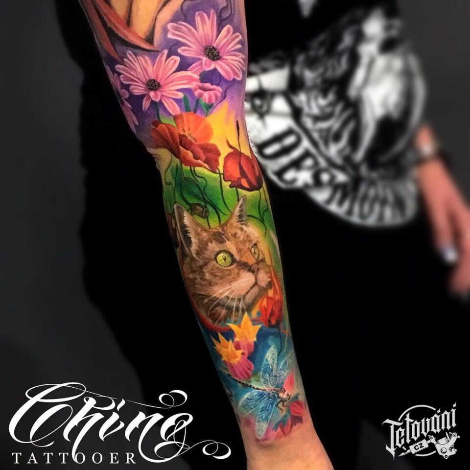 Tetování květiny, luční kvítí a zvířata, kočka a vážka na rukáv
