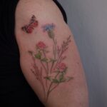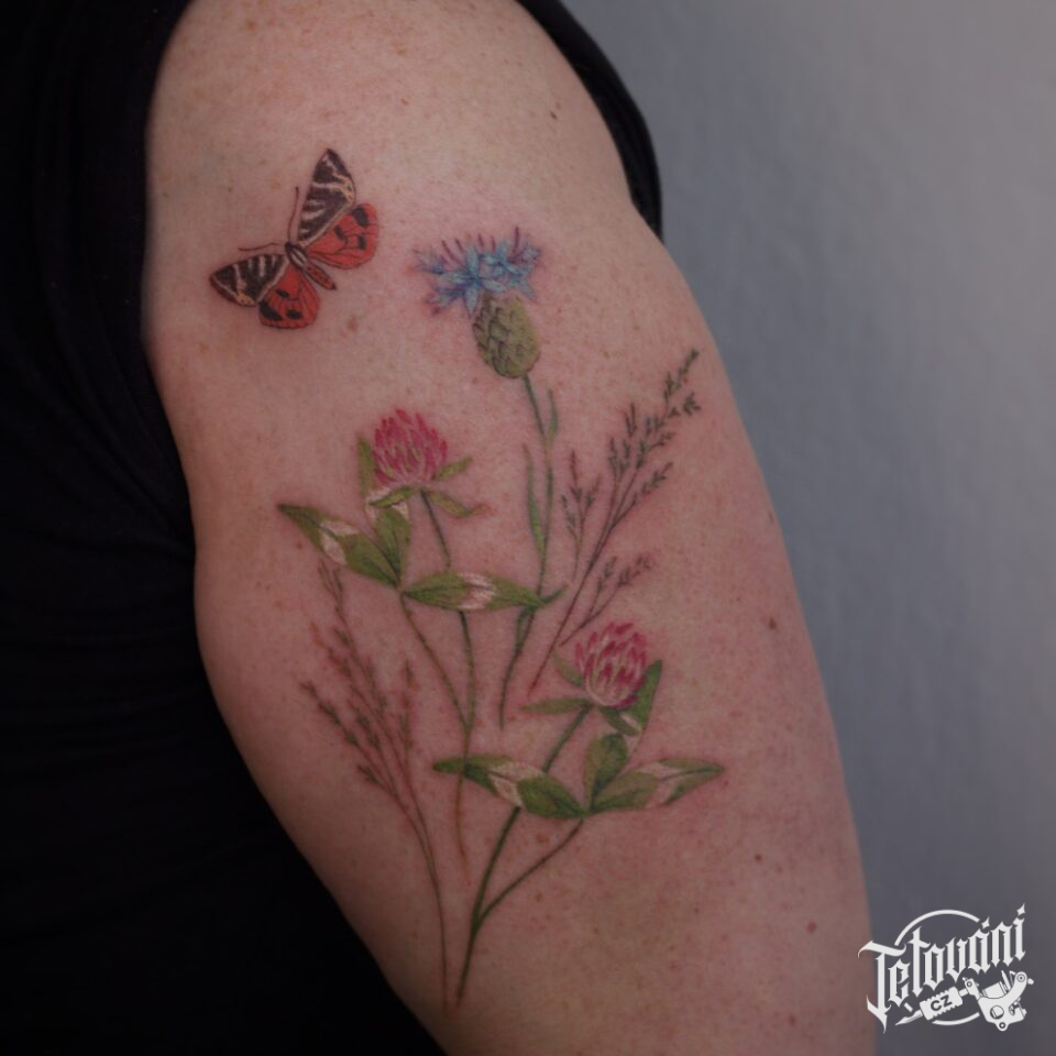 Tetování květiny, luční kvítí a zvířata, motýl na rameno