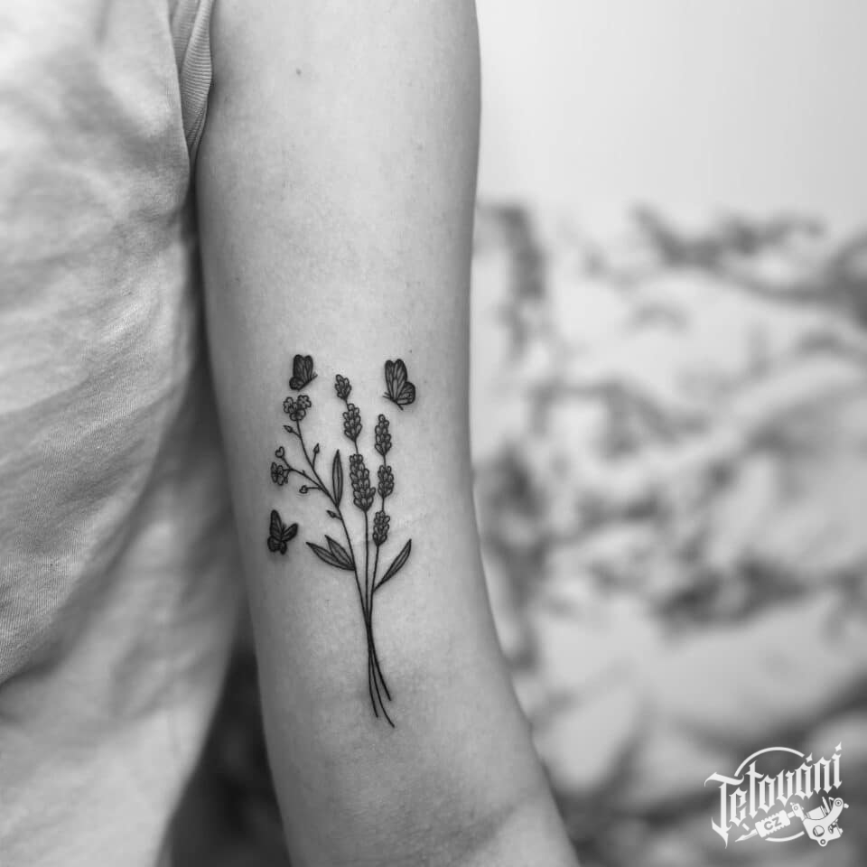 Tetování květiny, luční kvítí a zvířata, motýli na paži