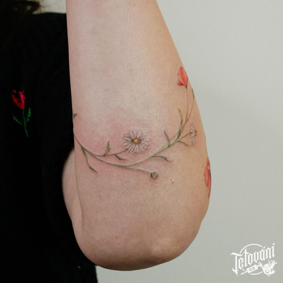 Tetování květiny, luční kvítí, kopretiny na předloktí