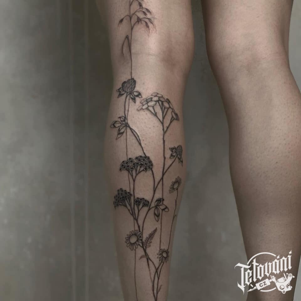Tetování květiny, luční kvítí na lýtku