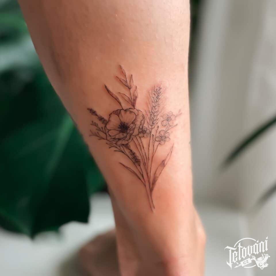 Tetování květiny, luční kvítí na lýtku