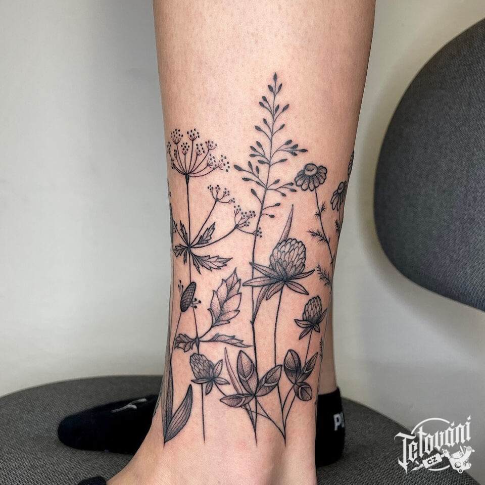 Tetování květiny, luční kvítí na noze