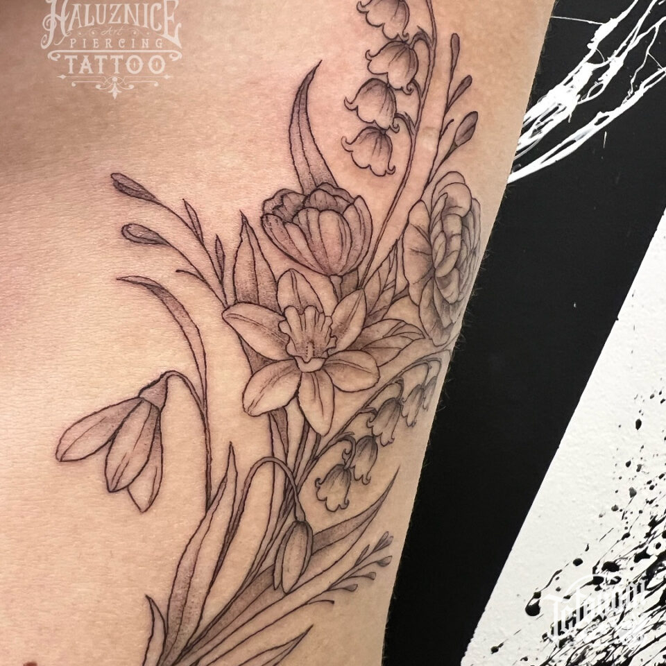 Tetování květiny, luční kvítí na noze