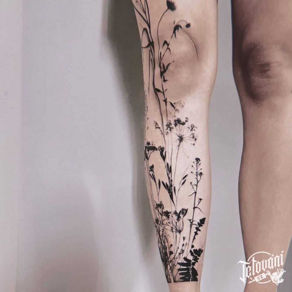 Tetování květiny, luční kvítí na noze