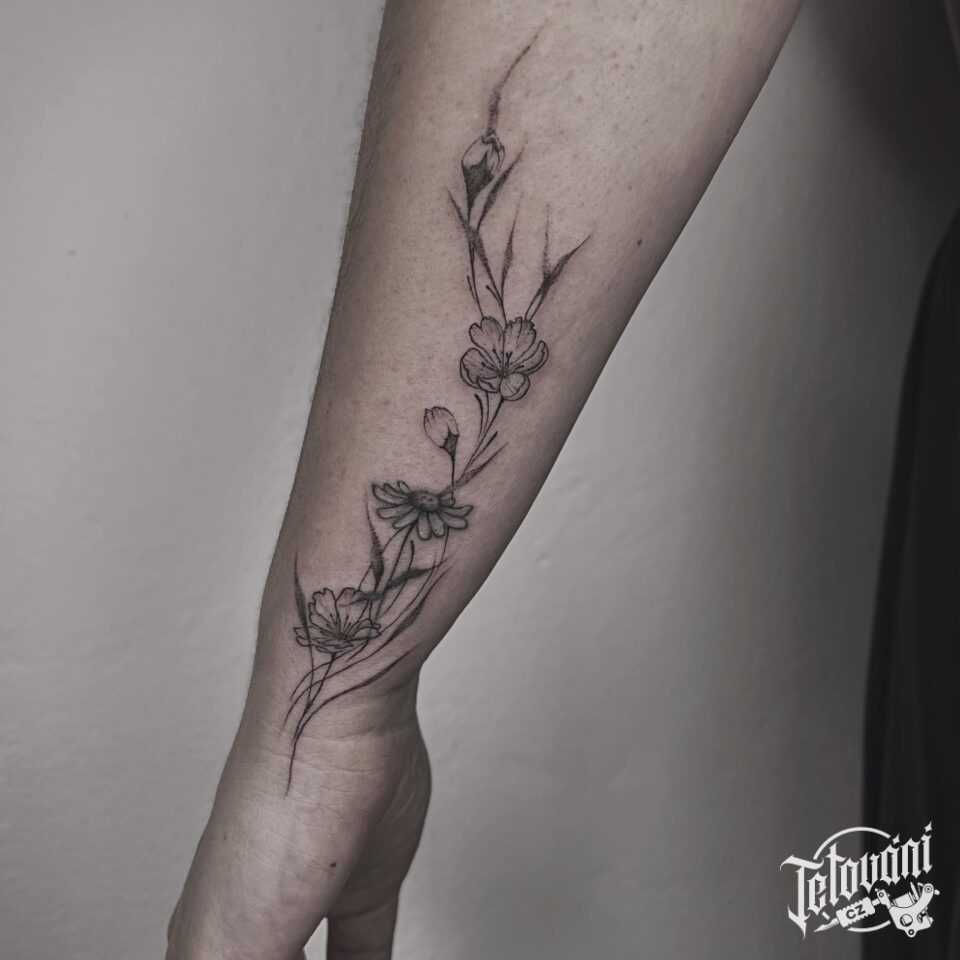 Tetování květiny, luční kvítí na předloktí