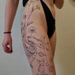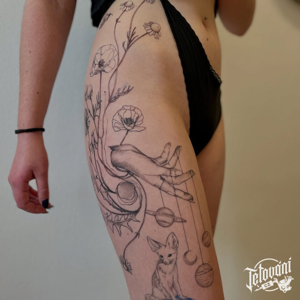 Tetování květiny, luční kvítí, ruka, planety na boku stehna