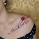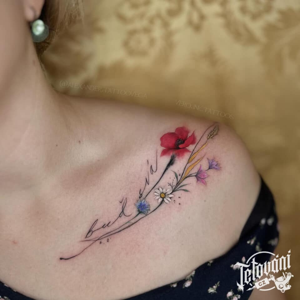 Tetování květiny, luční kvítí s nápisem pod klíční kostí