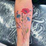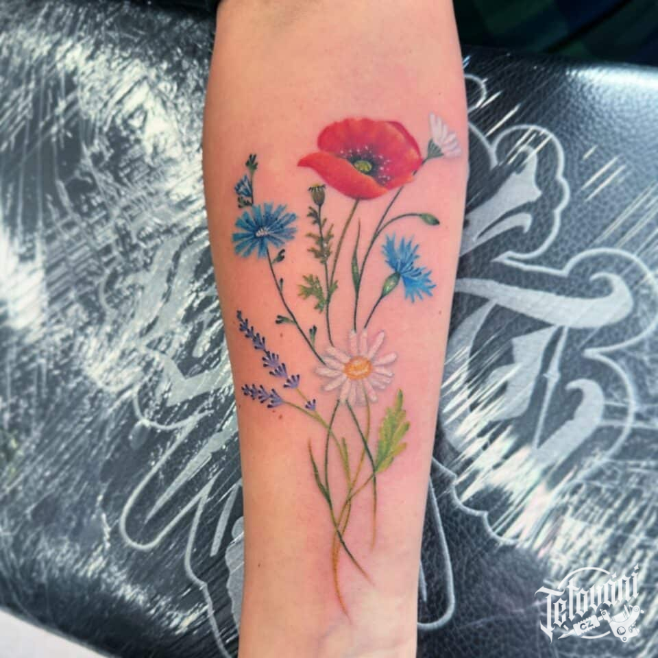 Tetování květiny, luční kvítí, vlčí mák a kopretina na předloktí