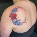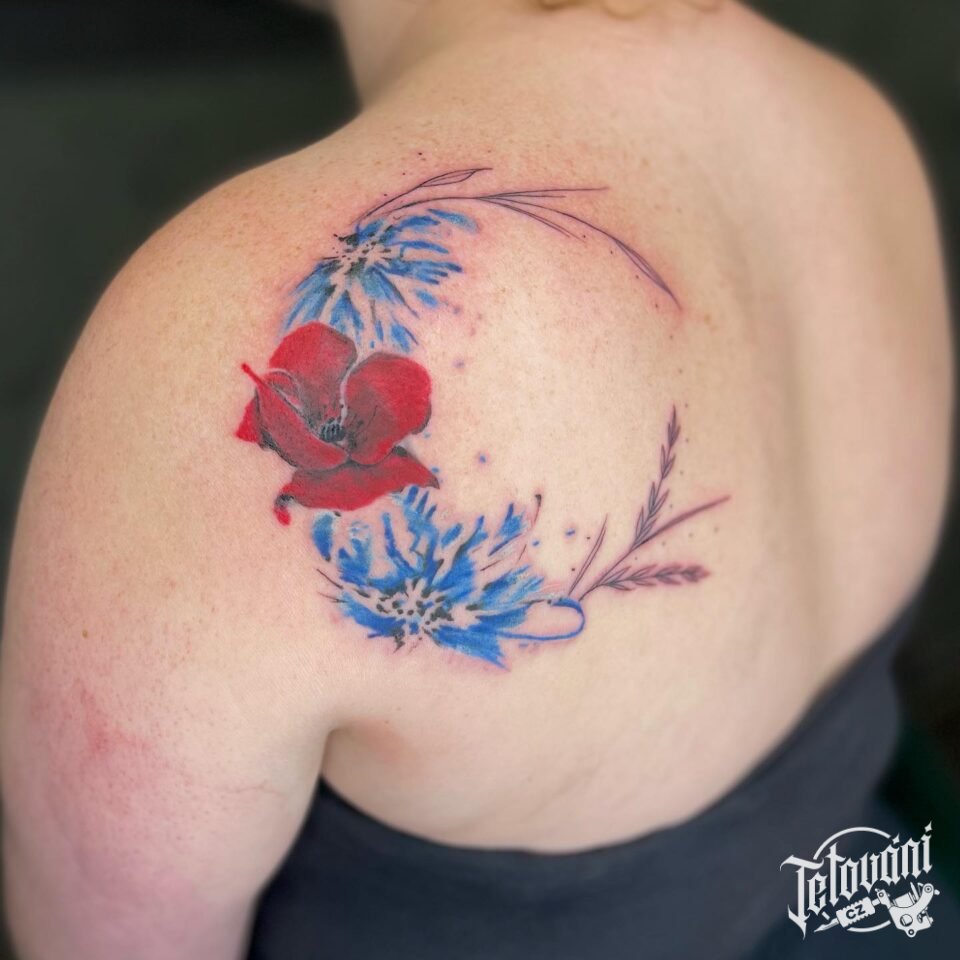 Tetování květiny, luční kvítí, vlčí mák na lopatce