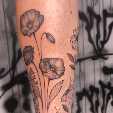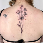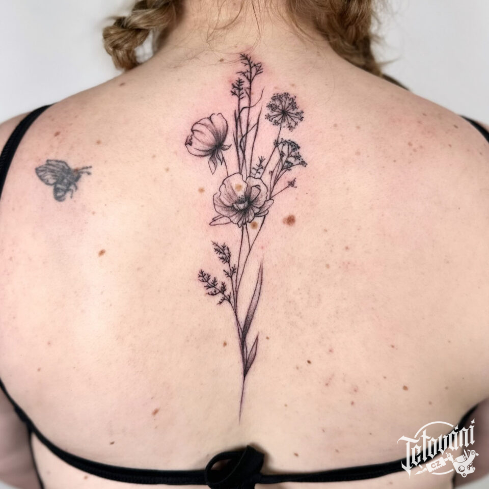 Tetování květiny, luční kvítí, vlčí mák na páteř