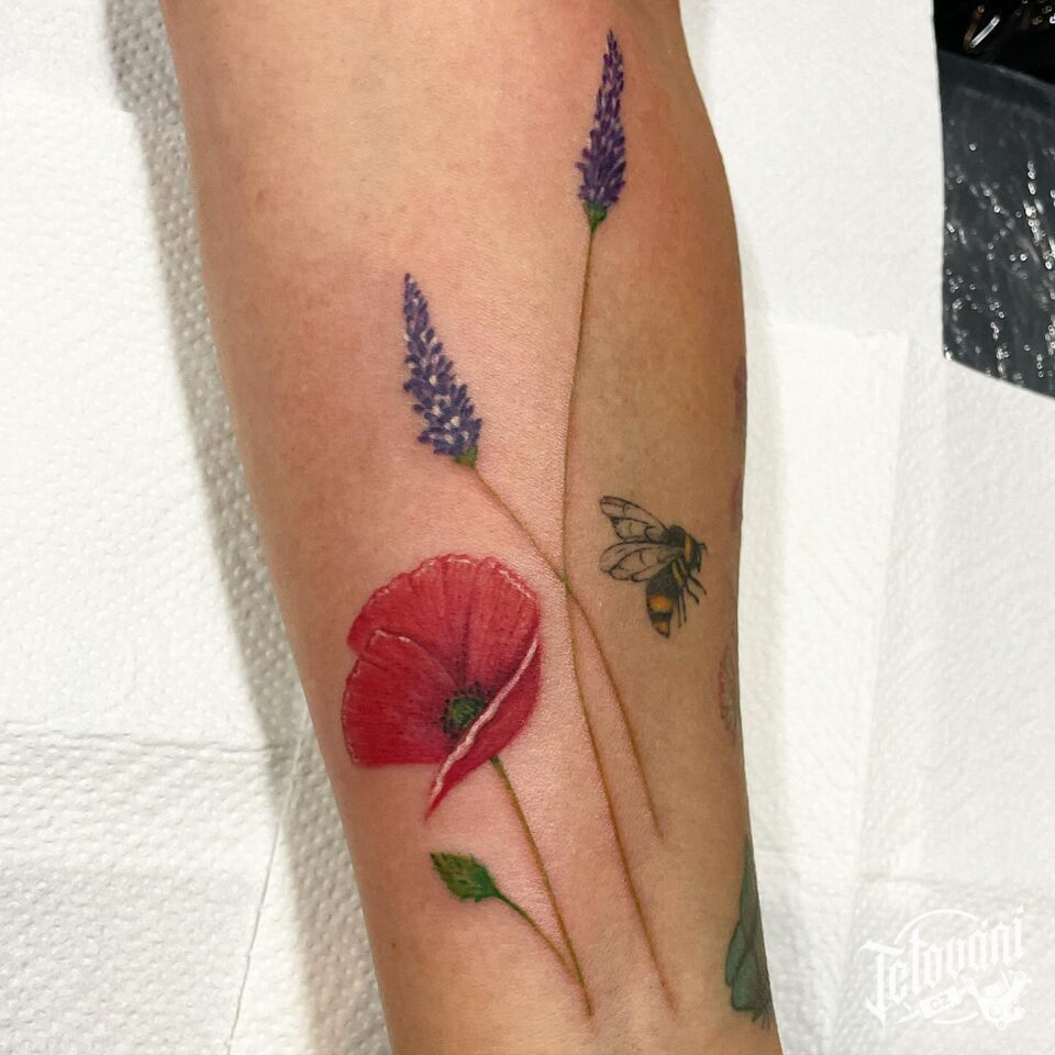 Tetování květiny, luční kvítí, vlčí mák na předloktí