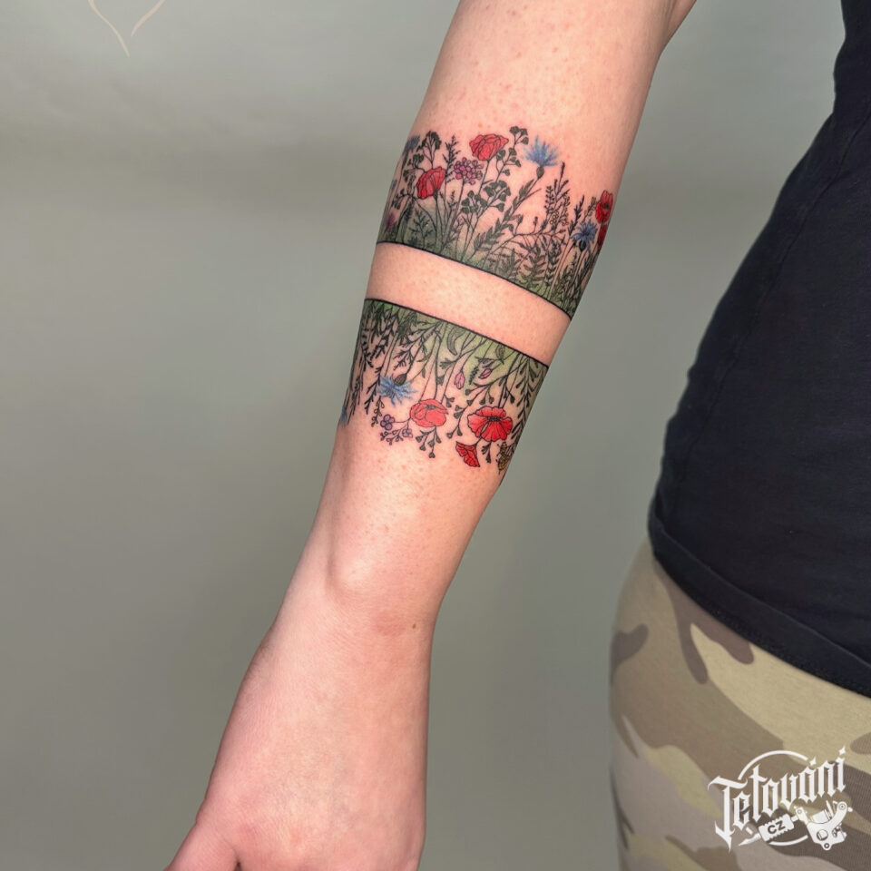 Tetování květiny, luční kvítí, vlčí máky na předloktí