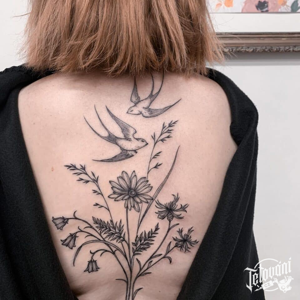 Tetování květiny, luční kvítí, zvířata vlaštovky na záda