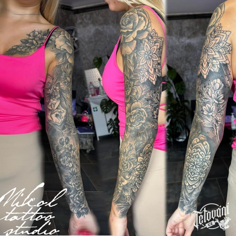 Tetování květiny, mandala, ornamenty na rukávu