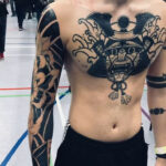 Tetování květiny, maska Hanya, mýtické bytosti, drak na záda