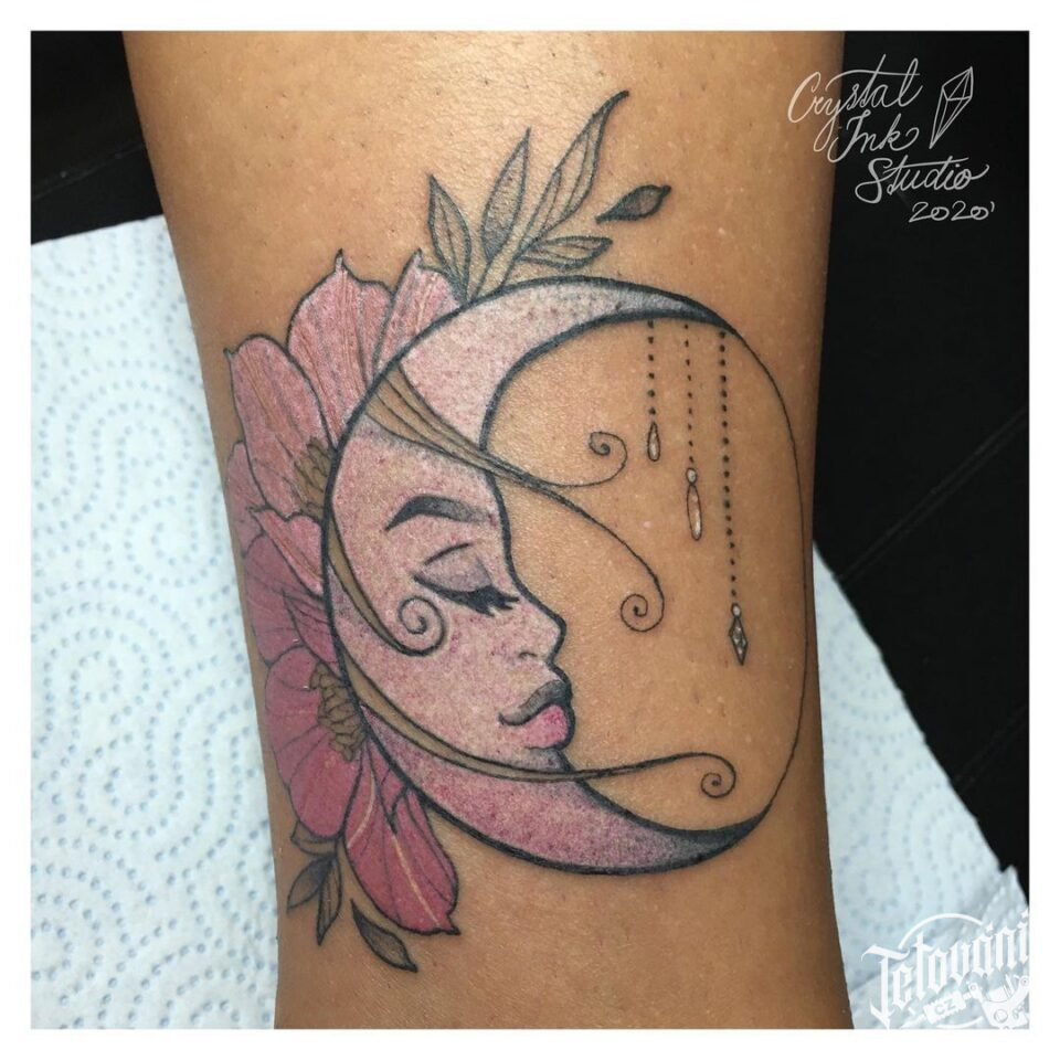 Tetování květiny, měsíc na lýtko