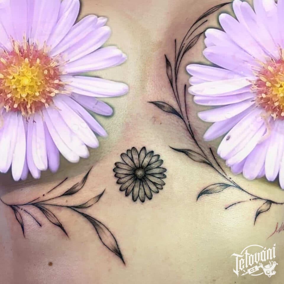 Tetování květiny mezi prsa