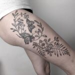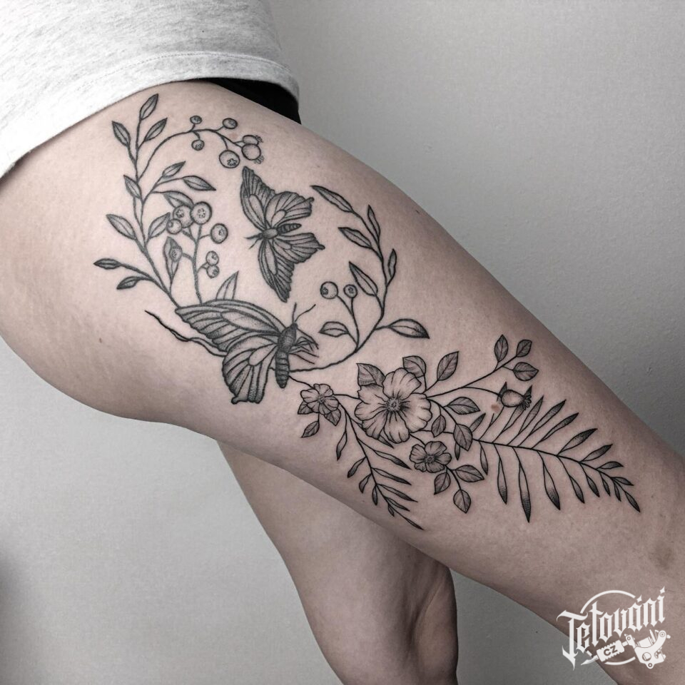 Tetování květiny, motýl, zvíře na bok stehna