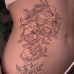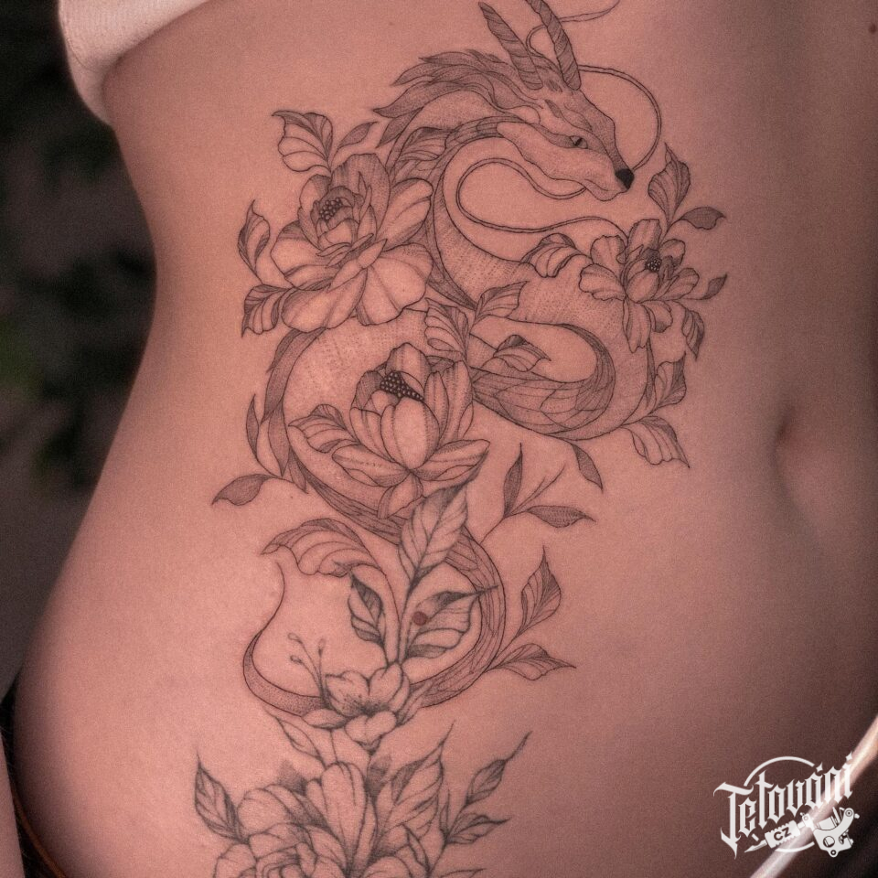 Tetování květiny, mýtická bytost drak na břicho