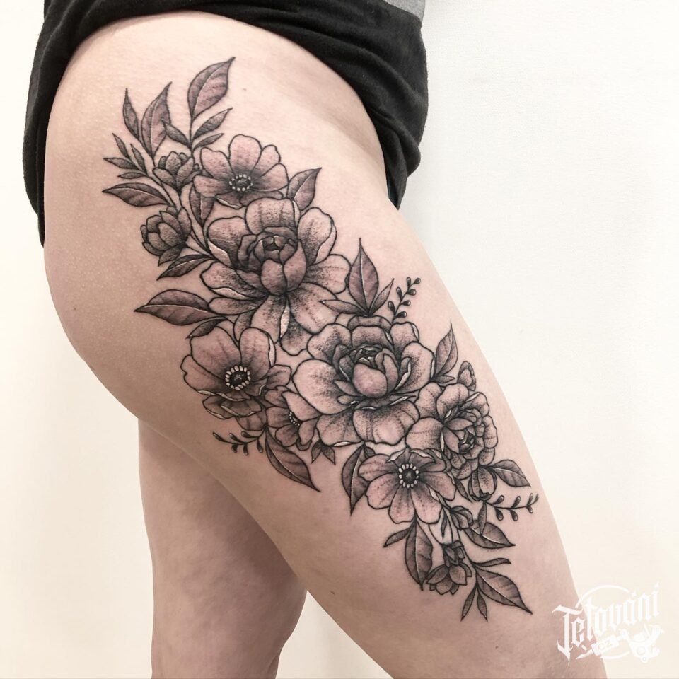 Tetování květiny na boku stehna