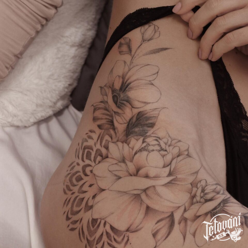 Tetování květiny na boku stehna