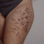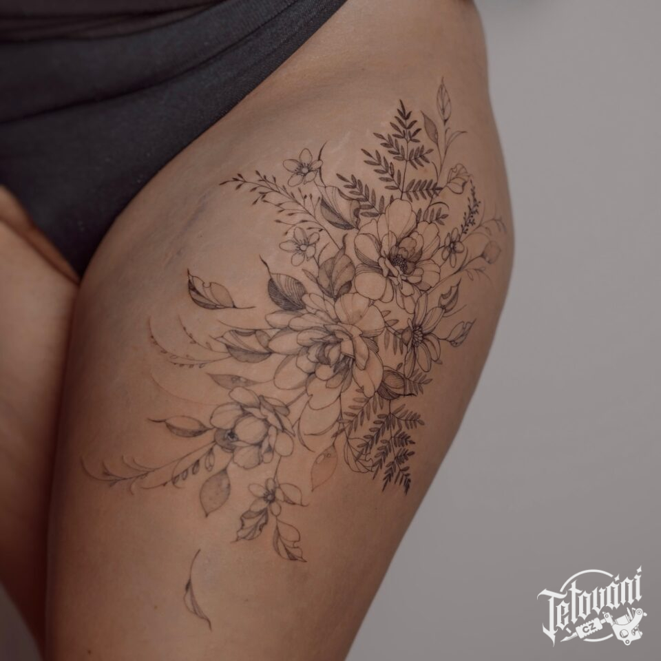 Tetování květiny na boku stehna