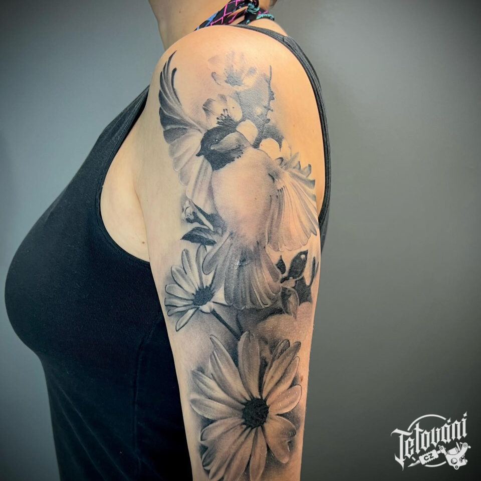 Tetování květiny a zvířata, pták na rameno