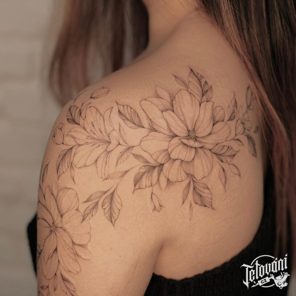 Tetování květiny na rameno a lopatku