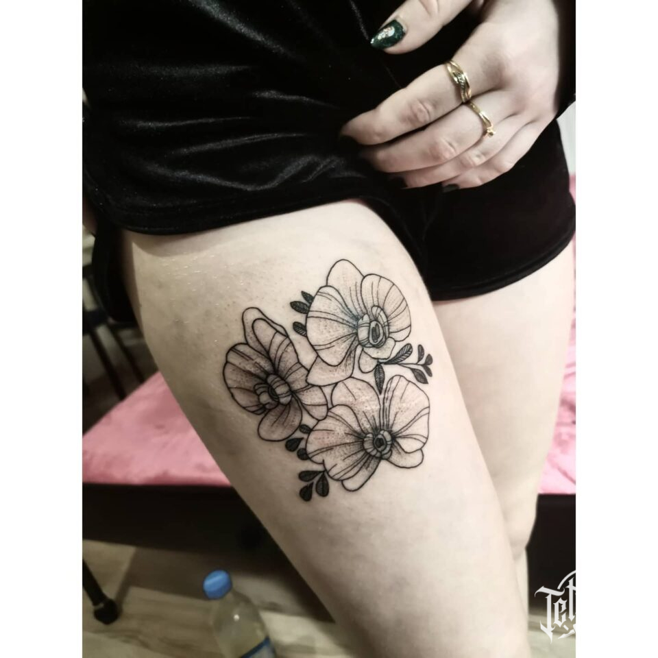 Tetování květiny, orchideje na stehně