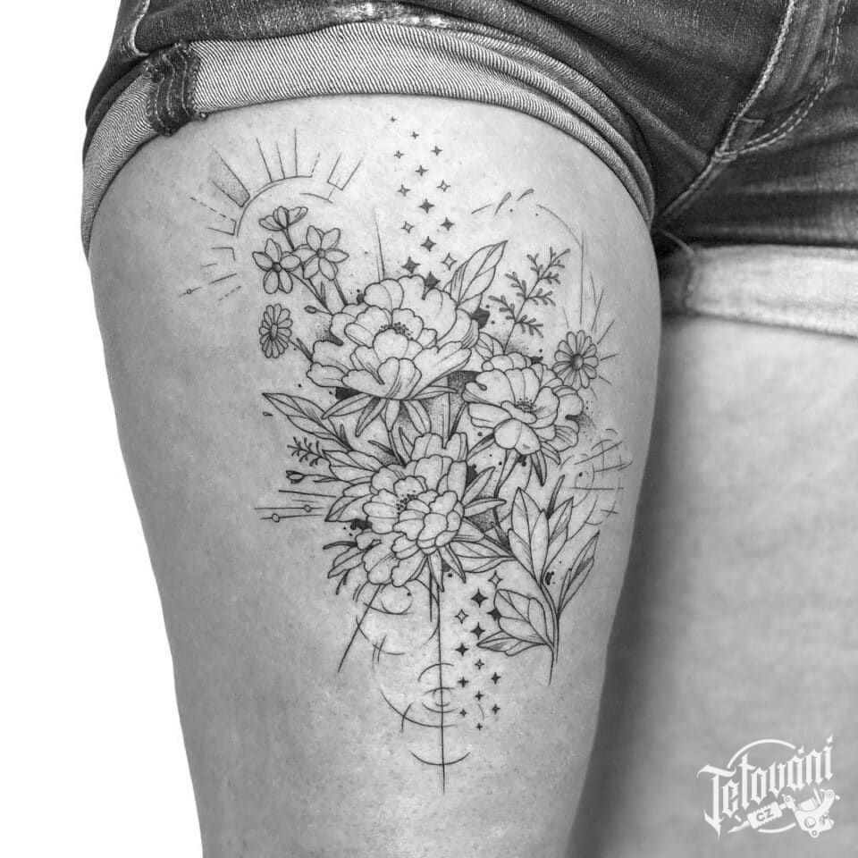 Tetování květiny na stehně