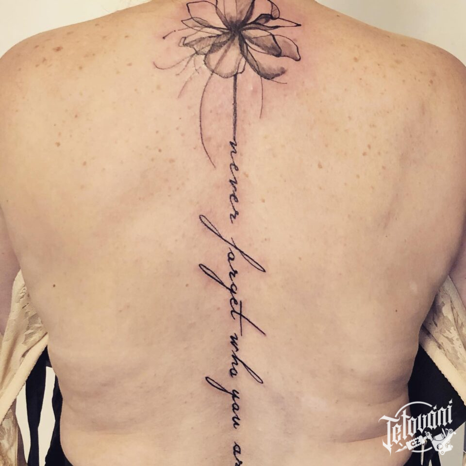 Tetování květiny, nápis, citát na páteř