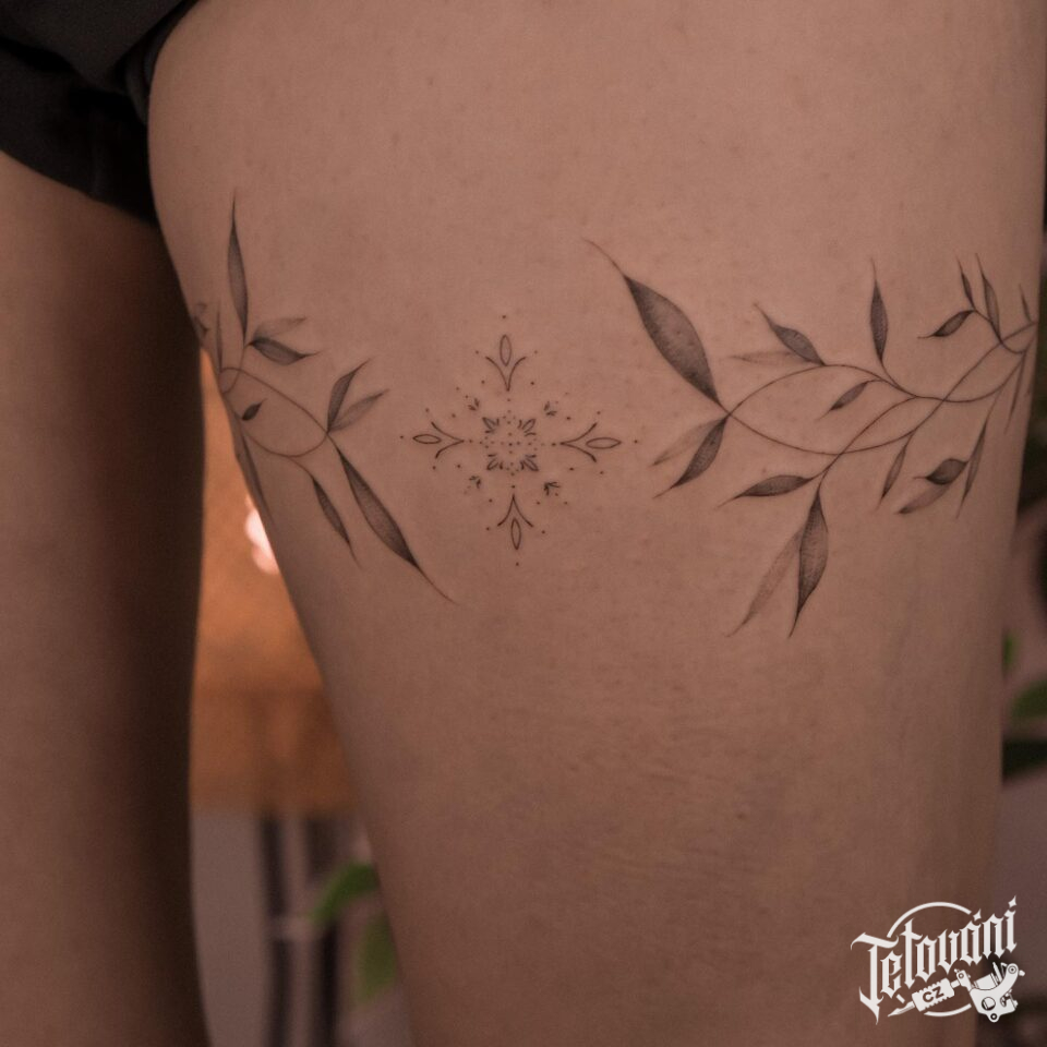 Tetování květiny, ornamenty na stehno