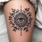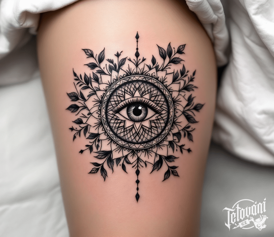 Tetování květiny, ornamenty, oko, kruh, tvary na stehno