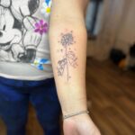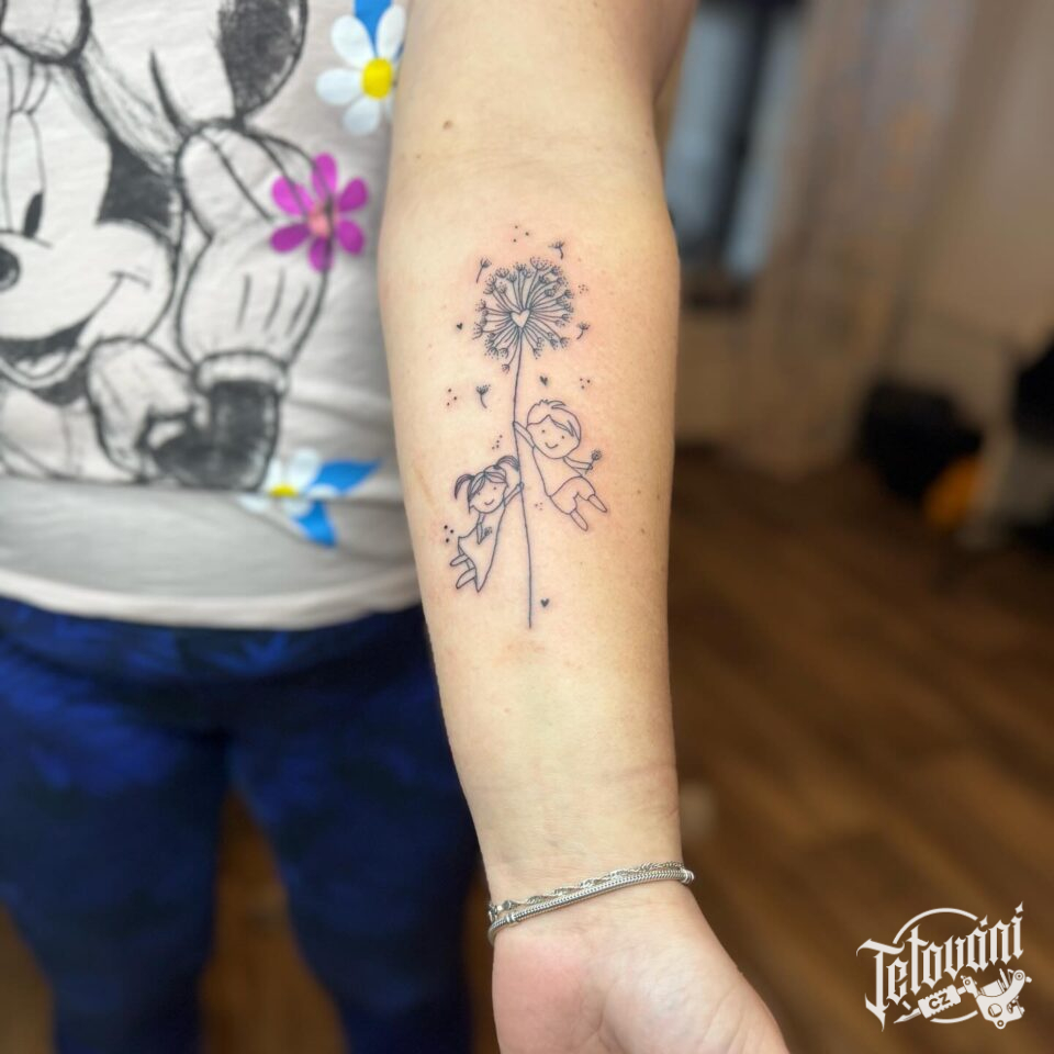 Tetování květiny, pampeliška a symbol rodiny na předloktí
