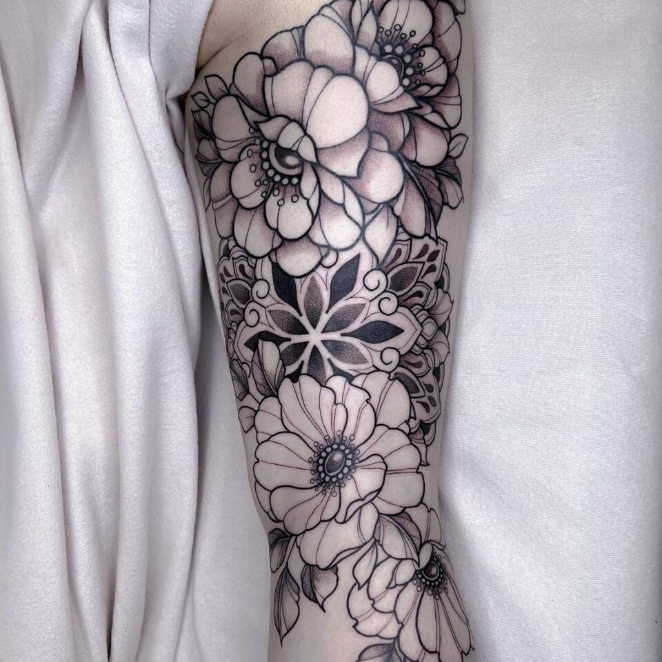 Tetování květiny pivoňka a mandala na nohu