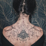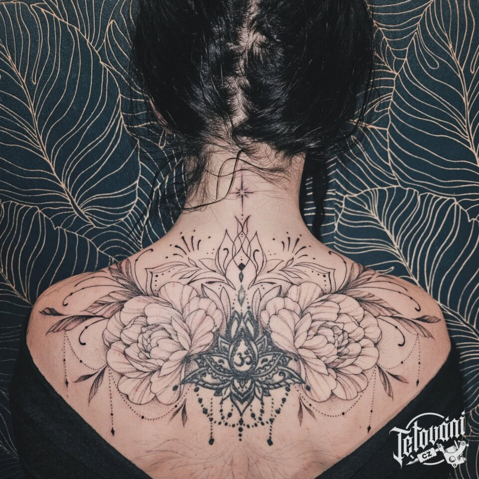 Tetování květiny, pivoňka, mandala na záda