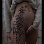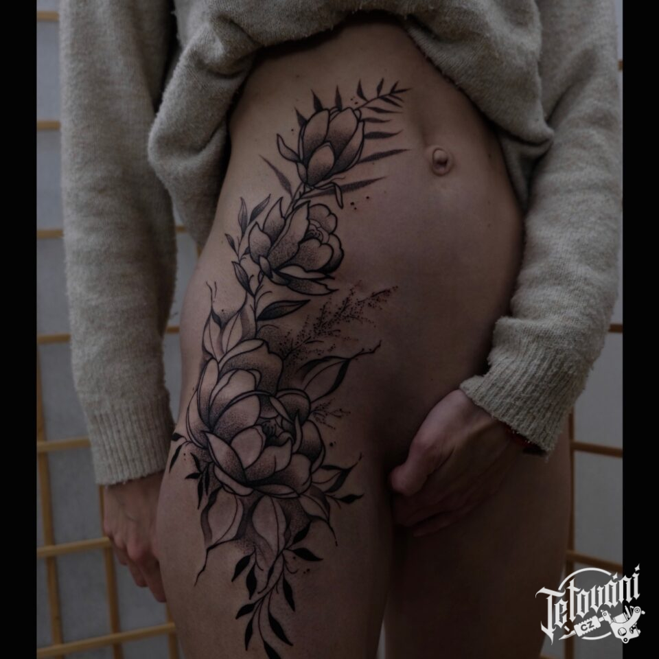 Tetování květiny, pivoňka na bok stehna